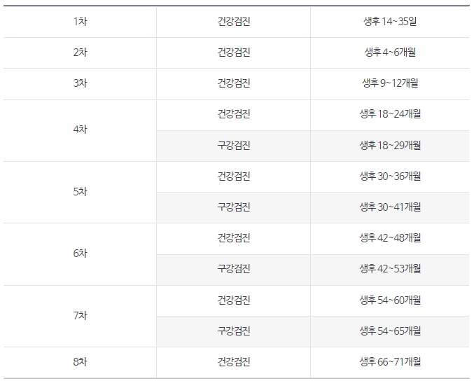영유아 건강검진은 정해진 시기에 맞춰 진행해야하며, 시기기 지난 후 진행할 시에는 본인 부담금이 발생한다. 미리미리 예방접종일과 맞춰서 스케줄을 짜놓고 예약을 해두는 것이 좋으며, 작성할 문진표와 평가지의 항목이 상당하기 때문에 미리 집에서 핸드폰 어플이나 PC에서 작성하고 내원하는 것이 좋다. 스마트폰에서 국민건강보험을 검색해서 어플을 다운받은 뒤, 인증 로그인을 하고, 건강검진 항목으로 들어가, 영유아건강검진을 클릭하면 문진표와 평가지를 작성할 수 있다.