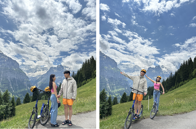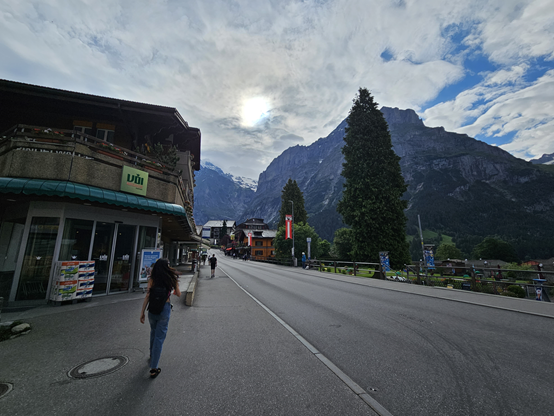 풍족한 식사를 마치고 숙소로 향했다. 간단히 씻고 휴식을 취한 후 날씨가 너무 좋아 숙소 정원에서 셀프 사진을 찍기로 했다. 우리가 Hotel Cabana를 예약한 가장 큰 이유가 바로 숙소 뒤로 보이는 아이거 북벽 뷰 때문인데 이곳에서 사진을 찍기로 하였다. 푸른 하늘 사이로 펼쳐진 뭉게구름과 초록빛 그린델발트의 풍경이 어우러져 너무나 예쁜 순간이 담겼다. 이런 순간을 매일 보고 사는 이곳사람들은 얼마나 행복할까 싶었다.