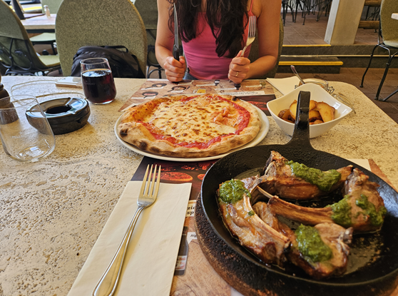 신나게 트로티바이크를 타고 종착지인 그린델발트 곤돌라역에 도착하여 바이크를 반납했다. 단연코 스위스 여행 중 최고의 순간 중 하나였다. 융프라우를 여행할 예정이라면 반드시 이곳의 액티비티도 함께하기를 추천한다. 피르스트 액티비티를 마치고 허기가 져서 근처 식당에 들러 점심을 먹기로 하였다. Steinbock이라는 호텔 겸 레스토랑이었는데 마게리타 피자(19.5프랑)와 양고기(48프랑)를 시켰는데 정말 맛있었다.