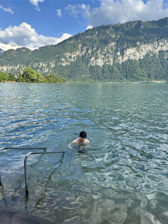 셀프 촬영을 마치고 우리는 버킷리스트 중에 하나였던 호수 수영을 해보기로 하였다. 인터넷에 검색하니 툰호숫가에 위치한 Neuhaus라는 곳에서 수영을 즐기며 놀기에 좋다고 하여 가보기로 했다. 수영복과 돗자리를 준비하여 인터라켄으로 향했고 동역에서 버스를 타고 Neuhaus까지 갈 수 있었다. 평화로운 호숫가에는 돗자리를 깔고 여유로운 시간을 보내는 사람들로 가득했다. 호숫물은 생각보다 매우 차가웠고 감히 들어갈 엄두가 나지 않았다. 하지만 언제 스위스 호수에 몸을 담그고 수영을 해보겠냐는 생각으로 눈딱감고 뛰어들었다. 후회는 없었다. 돗자리에 누워 태양볕을 쬐니 물기가 금방 말랐고 세상 평화로운 휴식을 취했다.