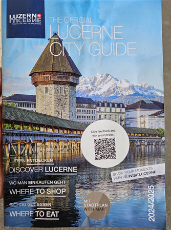 루체른역에서 인포메이션에 들르면 루체른 가이드북을 받을 수 있다. 우리 숙소 로비에서도 가이드북을 받을 수 있었는데 나중에 알았다. 가이드북의 한페이지에 나와있는 쿠폰을 상점에 보여주면 초콜릿과 열쇠고리를 공짜로 받을 수 있다. 우리는 숙소까지 걸어가는 길에 Bachmann라는 초콜릿 가게와 Casagrande라는 기념품 상점에 들러 받았다. 기념품 상점은 3층 높이로 굉장히 컸고 아침에 봤던 빅토리녹스를 포함해 웬만한 스위스 기념품은 모조리 있는 것 같았다.
