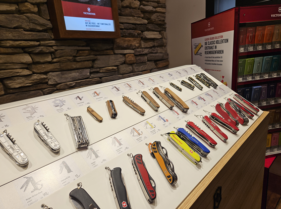오늘은 여행 마지막날이라 기념품이나 선물을 좀 보려고 생각했는데 골목 초입구에 빅토리녹스(Victorinox) 매장이 있어 들어가 보았다. 스위스 군용칼을 대표 상품으로 판매하고 있고 시계, 의류, 여행 가방까지 다양한 제품이 많았다. 스위스 제품은 워낙 내구성과 안전성으로 유명하여 눈길이 가는 제품이 많았다. 인터넷으로 서칭해보니 식칼과 감자깎기가 워낙 유용하다고하여 구매하기로 했고 지인 선물로 군용칼도 구매했는데 이니셜을 새겨주어 특별했다. 직원분이 한국어가 능통한 조선족 분이어서 이것저것 물어보며 즐겁게 쇼핑하였다. 생수도 서비스로 주셨는데 한국인은 여기서 쇼핑하면 편리할 것 같다.