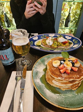 버러우 마켓을 떠나고 이리저리 돌아다니다 우연히 빌스 레스토랑(Bill's restaurant)을 발견하였다. 이곳은 영국의 대표적인 체인 레스토랑으로 모던 유러피언 메뉴로 사랑받는 곳이라 한다. 펜케이크를 여러겹 쌓아올린 비주얼에 매료되어 이전부터 먹고 싶었는데 마침 잘되었다고 생각했다. 펜케이크, 아보카도 토스트, 시그니처 맥주, 커피를 주문하여 정말 배터지게 먹었고 한국돈 6만2천원 정도 지불하였다. 햇살 비추는 야외 자리에 앉고 싶었지만 식당 안밖에 모두 사람이 많아 겨우 자리잡고 먹을 수 있었다.