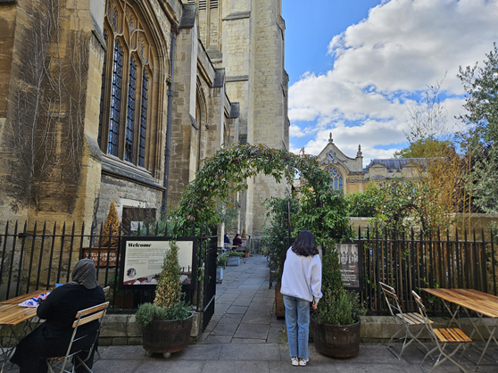 식물원에서 화장실도 가고 잠도 자고 풀 충전을 하고 다시 옥스퍼드 탐방을 시작했다. 먼저 방문한 옥스퍼드 성모 마리아 교회는 무려 1280년에 지어졌는데 높은 건물이 거의 없는 옥스퍼드에서 훌륭한 전망을 제공하는 곳이라 한다. 올라가보지는 않았고 함께 위치한 Vaults & Garden 이라는 음식점에서 커피 한 모금 마셨다. 뒤로는 래드클리프 카메라라는 돔 형태의 도서관이 마주하고 있는데 원형 건축이라는 점이 단연 눈길을 끌었다. 몰두하며 래드클리프 카메라의 모습을 그리는 화가의 모습도 보였다. 탄식의 다리는 학생들이 자신의 성적표를 받고 지나면서 탄식의 한숨을 쉬었다고 해서 지어진 이름인데 베네치아의 탄식의 다리가 생각이 났다. 학생들의 학위수여식 등의 행사가 열리는 셸도니안 극장, 파란 건물이 인상적이던 블랙웰 서점도 인상적이었다.