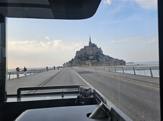 옹플뢰르 구경을 마치고 드디어 노르망디 투어의 하이라이트 몽생미셸로 향했다. 성 미카엘의 산이라는 뜻을 가진 몽생미셸(Mont-Saint-Michel)은 작은 바위섬에 지어진 최대 80m 높이에 이르는 수도원이다. 조수간만의 차가 큰 노르망디 해변의 작은 섬에 올곧게 새워진 이곳은 1년에 3~4번 찾아오는 대만조때는 섬이 물위에 떠있는 것처럼 보인다고 한다. 이곳에서 운행하는 버스로 갈아타고 몽생미셸로 향하게 되는데 저멀리 보이는 바위섬 건축은 정말 역대급이었다. 바다 위에 우뚝 솓은 수도성의 위용이 장관이었다. 영화에서만 볼 법한 건축이 수백년전부터 만들어진 것이라니 믿기지 않았다. 실제로 이곳은 반지의 제왕, 라푼젤 등 다양한 영화의 배경 소재로 쓰였다고 한다. 몽생미셸의 첫인상은 경이로움 그 자체였다.