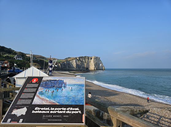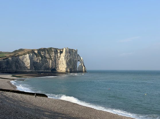 에트르타(Etretat)는 프랑스 북서부의 노르망디 지방의 작은 마을이다. 이곳은 19세기 말에 철도와 역이 건설되면서 해변 휴양지로 변모했다고 한다. 아름다운 해변과 더불어 아치를 포함한 석회암 절벽으로 유명한데, 코끼리 모양을 닮아 코끼리 절벽으로 불린다. 19세기에 많은 예술가들이 이 절벽의 풍광을 그리기 위해 몰려왔는데 인상파 화가로 유명한 모네도 그 중 한명이다. 해변 한복판에는 모네가 절벽을 보고 그린 [에트르타, 아발의 수문, 항구를 떠나는 낚시배] 라는 작품에 대한 설명이 있다. 바람부는 이곳의 풍경은 마치 제주도의 섭지코지, 오키나와의 만좌모와 비슷한 느낌이었다. 1시간 정도 남짓 이곳을 둘러보고 다음 행선지로 이동하였다. 지평선이 보이는 광활한 지대를 달리다 유명한 노르망디교를 마주쳤다. 프랑스 북부 센 강에서 오트노르망디 지역의 르아브르와 바스노르망디 지역의 옹플뢰르 두 항구도시를 잇는 사장교로 완공 다시 세계에서 가장 긴 사장교였다고 한다.