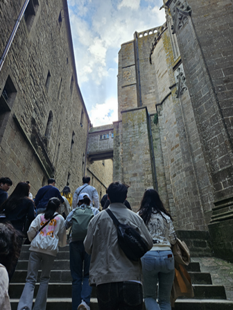 정문을 통해 들어가면 생각보다 많은 상점이 입점해있다. 정상을 따라 올라가기 위해 상당히 많은 계단을 걸어야 하는데 성 내부에 있는 많은 볼거리와 먹거리가 유혹한다. 가이드의 설명을 따라 정상까지 걸었고 이곳의 역사도 마치 영화같았다. 처음에는 성당과 수도원으로 건설되었지만 전략적 요충지로써 군사 요새화를 위한 공사도 별도로 진행되었다고 한다. 영국과 프랑스의 백년전쟁 때는 대포에 맞아 일부 무너졌고 다시 재건하면서 고딕 양식의 건축이 지어졌다고 한다. 이후 루이 15세 때는 감옥으로 탈바꿈되었고 프랑스 혁명 기간에는 정치범 수용소로 활용되었다고 한다. 80m에 달하는 정상에 도착하니 탁트인 갯벌과 지평선이 펼쳐졌고 수백년 전 그 옛날에 이 작은 섬에 이렇게 높고 아름다운 건축이 이뤄졌다는 것이 믿기지 않았다.