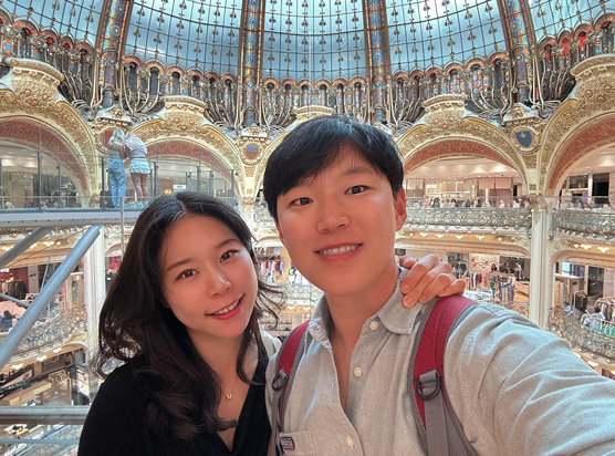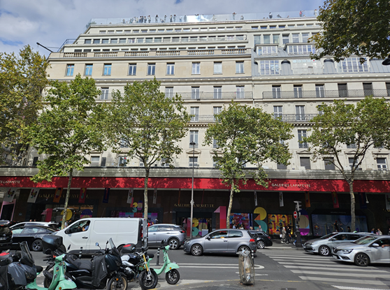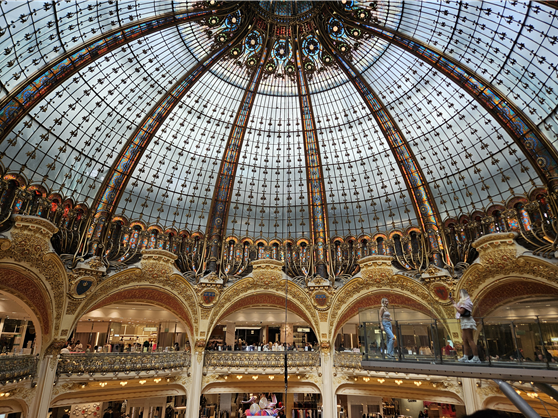 너무나 화려했던 오페라 가르니에 관람을 끝나고 다음 장소로 이동하였다. 바로 길건너편에 위치한 갤러리 라파예트 백화점을 방문하기로 하였다. 갤러리 라파예트는 1893년 작은 옷가게로 시작하여 번창하였고 이곳 오스만 지역에 10층짜리 본점을 두고 있다. 관광객들에게는 우아한 돔 구조의 천장과 루프탑 테라스로 인기가 많다. 백화점에 들어가서 에스컬레이터를 타고 쭉 올라가면 어느덧 유리와 철제로 된 돔 천장을 마주하게 된다. 1912년에 완공된 이 구조는 과거와 현재의 양식이 공존하는 파리 특유의 멋을 자아내고 있다. 돔 천장을 지나 올라가면 탁트인 루푸탑 무료전망대로 갈 수 있고 무료로 개방되어 부담없이 즐길 수 있다.