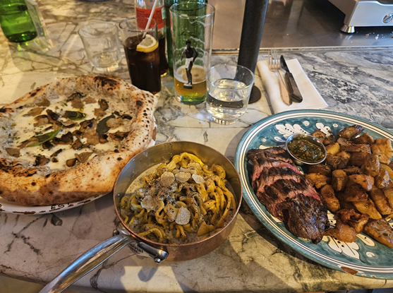 사크레쾨르 대성당에서 잔디 언덕을 따라 내려왔고 저녁 식사를 먹기로 하였다. 몽마르뜨 언덕 투어의 시작이었던 블렁슈 광장 근처 맛집을 둘러보다 우연히 이색적인 레스토랑을 발견했다. Pink Mamma 라는 곳인데 핑크색 외관과 옥상의 덩굴이 아름다워 한번 가보고 싶은 마음이 들었다. 오픈 30분전에도 웨이팅을 서는 사람들이 상당했다. 알고보니 우리나라 블로그에서도 몽마르뜨 맛집으로 유명한 곳이었다. 예약줄과 비예약줄이 헷갈렷는데 정문을 기준으로 오른쪽이 비예약줄이었다. 이곳은 예약도 어려울 만큼 인기가 많은데 특히 3층의 식사 공간은 수풀이 어우러져 정말 근사한 공간이었다. 우리를 포함하여 비예약자들은 차례로 바 자리로 안내해주어 식사를 할 수 있었다. 파스타, 스테이크, 피자와 음료까지 총 78유로의 비용이 들었고 너무나 맛있게 먹었다.