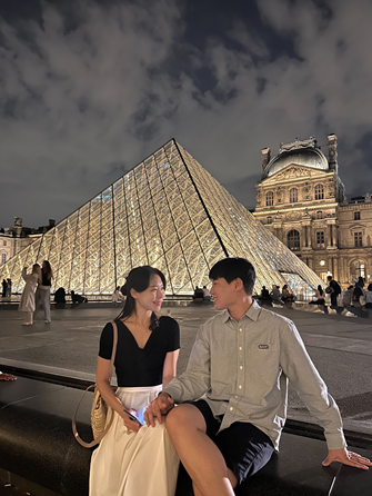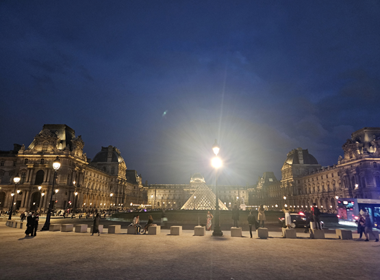 Pink Mamma에서 맛있는 저녁 식사를 마치고 야경을 구경하기로 하였다. 낭만의 도시 파리는 낮이든 밤이든 각양각생으로 아름답다. 특히나 루브르 박물관은 피라미드 모형에 조명이 비추어 그 아름다움을 더한다. 황금빛 조명이 비추는 루브르 궁과 피라미드를 배경으로 사람들은 사진을 찍기 바빴다. 멋스런 옛 프랑스의 궁전의 중심에 현대적인 건축미를 곁들인 유리 피라미드 구조물을 기획한 것이 너무나 조화로웠다.
