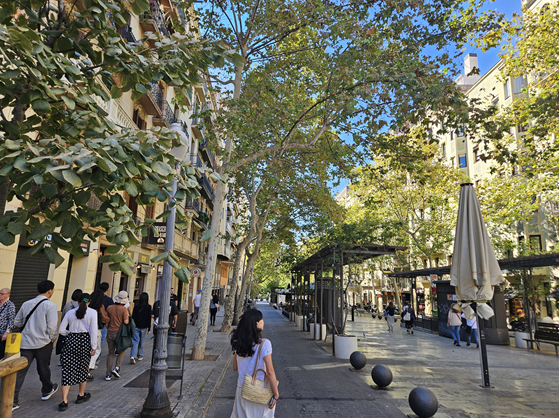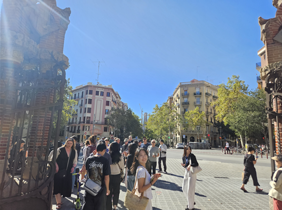 산 파우 병원과 사그라다 파밀리아 성당을 잇는 보행자 전용도로에는 가로수와 노천카페가 늘어서있는데 이곳을 가우디 거리라 부른다. 산 파우 병원 투어를 마치고는 가이드의 설명을 들으며 가우디 거리를 따라 걸었다. 바르셀로나의 역사, 가우디라는 사람의 파란만장한 인생 등 재밌는 얘기를 많이 들었다. 걸으면서 무엇보다 중요한 것은 절대 정면을 보지 말고 조심히 땅을 보고 걸으라는 것이다. 그러다 가우디 거리가 끝나고 사그라다 파밀리아 성당에 도착했을때 한번에 고개를 들어 성당을 응시하였다. 눈앞에 거대한 사그라다 파밀리아 성당의 실체가 펼쳐졌고 그 첫인상은 정말 장엄하고 환상적이었다. 그 어떤 도시에서도 만나 본적 없는 독특한 양식의 가우디 기법이 완전히 녹아든 거대한 성당은 너무나도 창의적이었다. 아직도 공사 중인 이곳은 가우디 사후 100주년이 되는 2026년 완공을 목표로 짓고 있다고 한다.