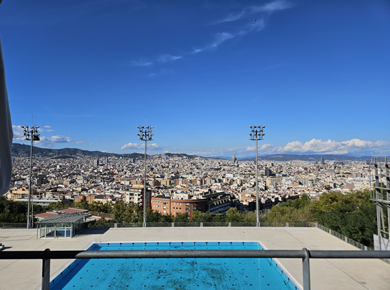 올림픽 경기장에서 도로를 따라 좀더 걸으면 몬주익 공영 수영장에 도착한다. 이곳은 과거 올림픽 경기나 굵직한 국제 수영 대회가 열리 곳인데 현재 일반인에게 무료로 개방되어있다. 원래 이곳에서 수영도 해보고 싶었는데 현재는 수영이 불가해서 구경만 하였고 함께 운영하는 바에서 잠시 쉬어가기로 하였다. SALTS 란 곳이었는데 수영장과 바르셀로나 시내 뷰를 바라보며 음료를 마시고 시원한 시간을 보낼 수 있는 곳이었다. 맑고 화창한 하늘과 함께 오늘 돌아다닌 바르셀로나 시내 전역이 한눈에 보였다. 불과 173m 밖에 되지 않는 언덕이었지만 시내가 이렇게 한눈에 들어오는 것은 인공 건축이 자연 언덕보다 높지 않게 건축하고자한 가우디의 철학 덕분이지 않나 싶었다.