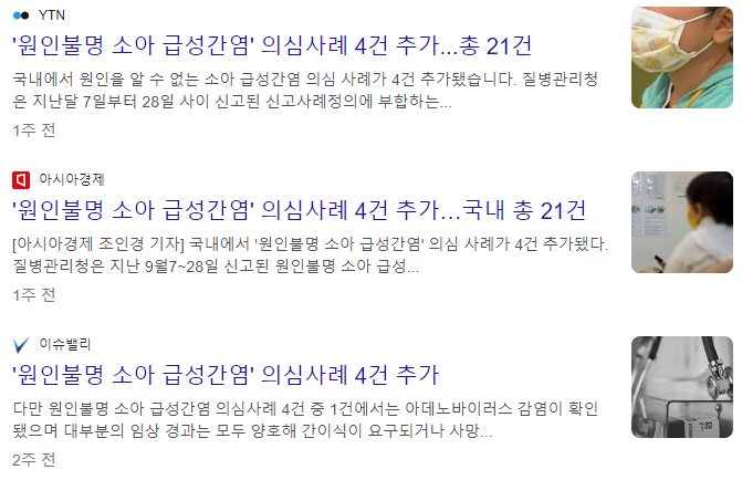 최근들어 국내 및 전세계적으로 '원인불명 소아 급성간염' 의 사례가 크게 늘고 있다. 신고 사례 정의에 부합하는 경우는 2022년 5월 이후 내원한 16세 이하의 소아청소년 환자 중 간수치가 500 IU/L 를 초과하면서 A·B·C·E형 바이러스 간염이 아닌 경우이다. 아데노바이러스 41형의 관련성이 높은 것으로 파악되나 정확치는 않은 상태이다. 복통 등 가벼운 증상에서 중증 간염으로 빠르게 진행되는 것을 특징으로 하며, 급성 간부전을 포함한 간 손상으로 간이식을 받은 사례도 존재한다. 워낙 다양한 원인과 증상을 보이는 소아 급성 간염에 대해 알아보면 다음과 같다.