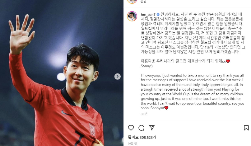 손흥민 선수가 수상한 안와골절의 정확한 위치와 크기는 언론에 공개되지 않아 알 수 없지만, 심한 합병증이 동반된 것이 아니라면 일반적으로 적어도 4주 이상의 시간이 필요하다. 골절된 뼈가 다시 단단히 붙고 재발되지 않기 위해서는 절대 안정이 필요하며, 상당 기간 무리한 운동도 불가하다. 11월 24일 한국과 우루과이의 월드컵 첫 경기가 있는데, 손흥민 선수가 수술한지 19일이 지났을 때이다. 경기전 훈련도 필요할 것이므로, 회복하여 정상적 컨디션으로 경기에 출전하기에는 상당히 무리가 있는 시간으로 보인다. 물론 사람마다 회복하는데 시간이 다르고, 수술 후 관리를 얼마냐 잘해주느냐에 따라 일상복귀가 더 앞당겨 질 수 있다. 누구보다 월드컵에 대한 절실함으로 무장한 손흥민 선수가, 많은 국민의 염원과 함께 무사히 회복되어 건강하게 월드컵에서 좋은 모습을 보여주길 기원할 뿐이다.