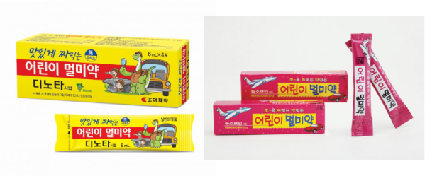 어린이를 위한 짜먹는 형태의 멀미약도 출시되어 있다. 성분은 이지롱액과 거의 유사하다. 디노타시럽은 디멘히드리네이트, 카페인, 피리독신으로 구성되어 있다. 소보민시럽은 디노타시럽의 성분에 니코틴이 추가되어 있다. 만 3세 이상에서 복용가능하며 1회 복용 후 최소 4시간의 간격을 지키며 하루 3번까지 복용가능하다. 3세 미만의 아이들은 전정기관이 아직 미성숙하여 멀미를 하지 않으므로, 멀미약을 복용할 필요가 없다.